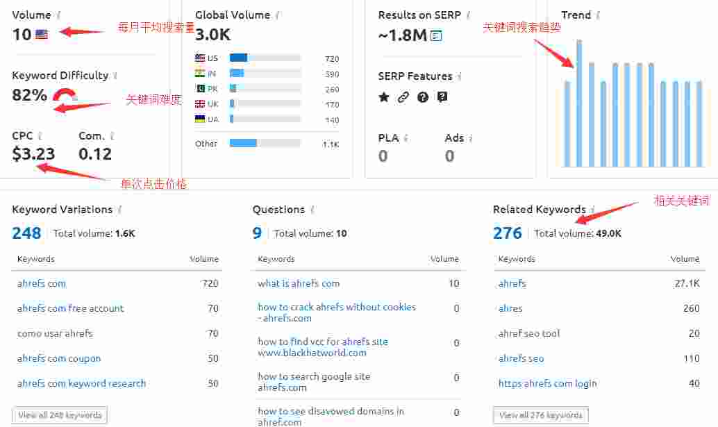 通过这里我们可以了解到网站的关键词的自然搜索量、单次点击费用、关键词难度、相关关键词等数据。
