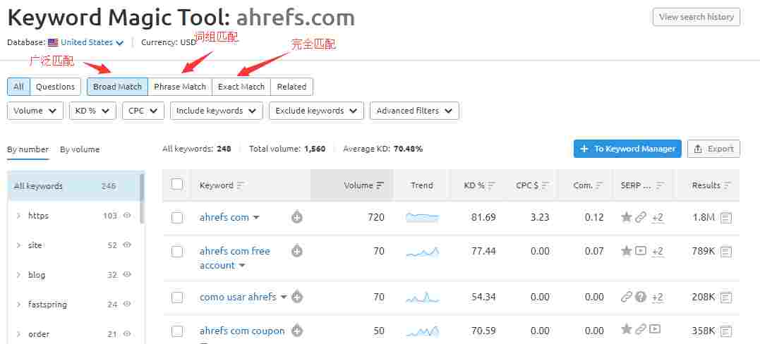 Keyword Magic Tool(关键词魔法工具)是分析网站核心关键词的所有其他关键词流量和相关参数统计结果。对于不知道如何拓展长尾词的朋友是很不错的工具。要注意选择的关键词不能只考虑某个关键词的参数比对,还是需要看关键词本身的含有。