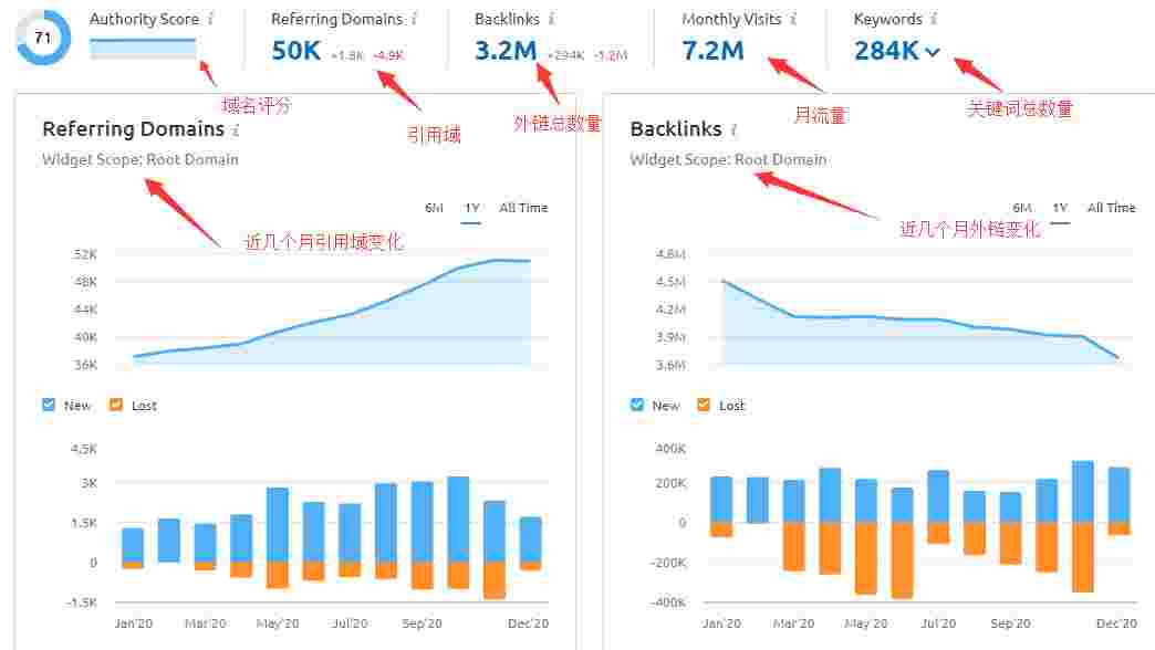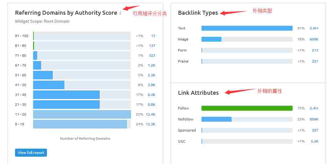 接下来,图片左侧部分是网站引用域按域名评分分类的外链总数量,引用域评分越高的外链导向目标网站的权重也相应的越高,因此,高权重域名外链对我们的网站提升权重是很有帮助的!
