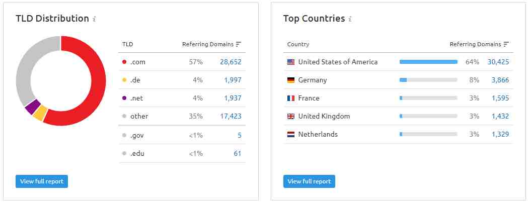 下图左侧是引用域域名类型占比,我们都知道,EDU/GOV的外链很难获得,因此很受搜索引擎的信任。右侧是各个国家引用域的占比。