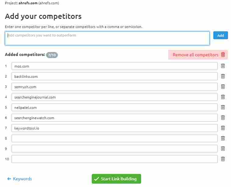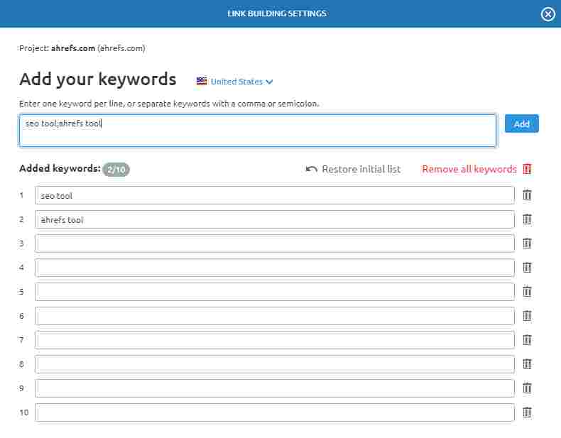 这是SEMrush的一个特色工具,当我们输入想要构建的外链域名后就会跳转一个页面,在页面的上半部分输入需要添加的关键词多个关键词用逗号隔开,然后点击右侧的添加按钮我们想要添加的关键词就会出现在下半部分的关键词列表中。如果想删除某个关键词只需要点击右侧的垃圾桶即可。