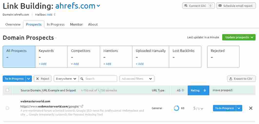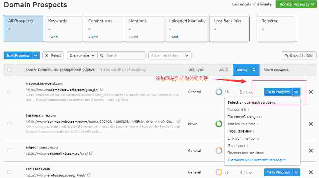 点击右侧的To In Progress按钮就可以将外链网站添加到我们的待做外链列表中去,之后就可以开始联系站长交换外链了。