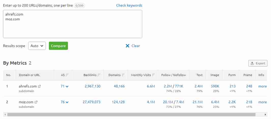 这个版块是SEMrush对网站的域名评分、外链总数量、引用域数量,外链属性、外链类型占比分析结果。可以帮助我们批量了解竞争对手网站的情况,一个可以查询200个竞争对手网站。